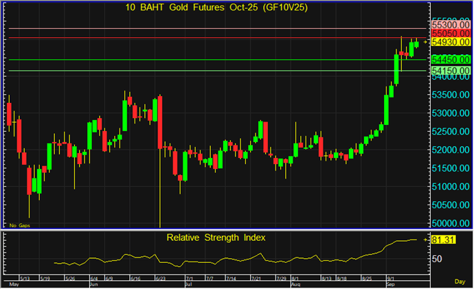 แม้ราคาทองโลกจะมีแนวโน้มฟื้นตัวขึ้น แต่ราคา GF10V25 กลับถูกกดดันด้วยเงินบาทที่แข็งค่า จึงยังแนะนำรอเปิด Short จากแนวต้านที่ระดับ 55,050 บาท โดยมีเป้าทำกำไรที่ระดับ 54,450 บาท และตัดขาดทุนหากราคาทะลุแนวต้านแรกที่ระดับ 55,300 บาทขึ้นไป
