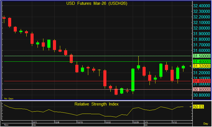 ราคา USDH26 เริ่มฟื้นตัวขึ้นในช่วงเช้า แต่ประเมินว่าราคาอาจผ่านแนวต้านที่ระดับ 31.40 บาทขึ้นไปได้ยาก จึงแนะนำรอเปิด Short จากแนวต้านดังกล่าว โดยมีเป้าหมายทำกำไรที่ระดับ 31.05 บาท และตัดขาดทุนหากราคาทะลุแนวต้านที่ระดับ 31.50 บาทขึ้นไป