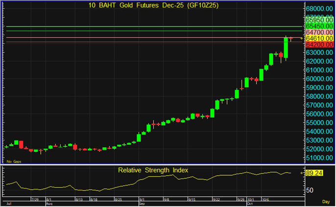 ทองโลกฟื้นตัวอีกครั้งในช่วงเช้า ราคา GF10Z25 จึงมีแนวโน้มปรับตัวขึ้นตาม แต่แนะนำรอเปิด Long จากแนวรับที่ระดับ 64,700 บาท โดยมีเป้าทำกำไรที่ระดับ 65,450 บาท และตัดขาดทุนหากราคาทะลุแนวรับที่ระดับ 64,200 บาทลงไป