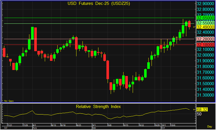 ราคา USDZ25 หลุดแนวรับที่ระดับ 32.55 บาทลงมา ประเมินว่าราคายังมีแนวโน้มปรับตัวลงต่อ จึงแนะนำไล่เปิด Short โดยมีเป้าหมายทำกำไรที่ระดับ 32.28 บาท และตัดขาดทุนหากราคาทะลุแนวต้านแรกที่ระดับ 32.55 บาทขึ้นไป