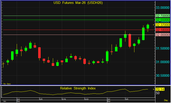USDH26 แนะนำรอเปิด Short จากระดับ 32.55 บาท โดยมีเป้าหมายทำกำไรที่ระดับ 32.18 บาท และตัดขาดทุนหากราคาทะลุระดับ 32.70 บาท