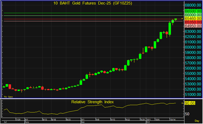 ทองโลกยังคงมีแนวโน้มปรับตัวขึ้นต่อเนื่อง ส่งผลให้ GF10Z25 อาจปรับตัวขึ้นตาม จึงยังแนะนำรอเปิด Long จากแนวรับที่ระดับ 65,350 บาท โดยมีเป้าหมายทำกำไรที่ระดับ 66,000 บาท และตัดขาดทุนหากราคาทะลุแนวรับที่ระดับ 64,950 บาทลงไป