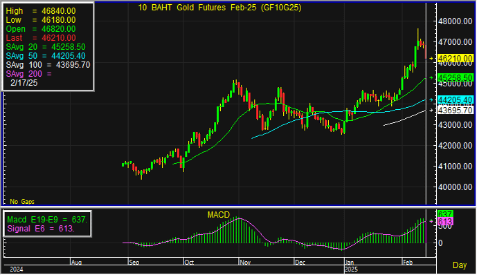 สัญญาณทางเทคนิคจาก MACD เริ่มชะลอตัวลง ซึ่งอาจเป็นสัญญาณว่าราคากำลังเข้าสู่ช่วงพักฐาน และสัญญาณจาก Modified Stochastic เข้าสู่ Overbought คาดว่า GF10G25 อาจปรับตัวลงระยะสั้น แนะนำเปิด Short ที่ระดับ 46,520 บาท โดยมีเป้าหมายทำกำไรที่ 45,740 บาท โดยมีจุดตัดขาดทุนที่ 46,700 บาท