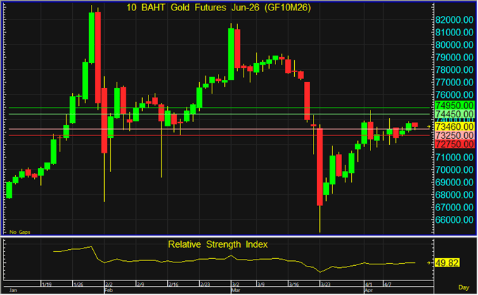 GF10J26 เผชิญแรงขายจนเริ่มย่อตัวลง แนะนำรอเปิด Long จากระดับ 73,250 บาท โดยมีเป้าหมายทำกำไรที่ระดับ 74,450 บาท และตัดขาดทุนหากราคาทะลุระดับ 72,750 บาทลงไป