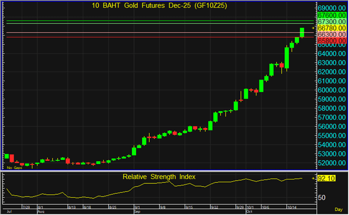 ทองโลกกลับมาผันผวนแรง แต่ประเมินว่าราคา GF10Z25 อาจยังมีแนวโน้มขึ้นต่อ จึงแนะนำรอเปิด Long จากแนวรับที่ระดับ 66,300 บาท โดยมีเป้าทำกำไรที่ระดับ 67,300 บาท และตัดขาดทุนหากราคาทะลุแนวรับที่ระดับ 65,800 บาทลงไป