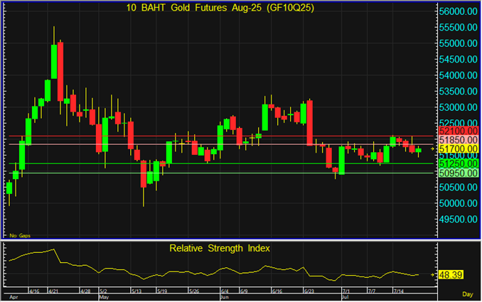 แม้ราคา GF10Q25 จะเริ่มปรับฐานลง แต่หลังลงทดสอบแนวรับเริ่มมีแรงซื้อกลับ ประเมินว่าราคาอาจยังซื้อขายในกรอบ 51,250-51,850 บาท จึงแนะนำรอเปิด Long จากบริเวณกรอบล่าง และรอเปิด Short จากบริเวณกรอบบน