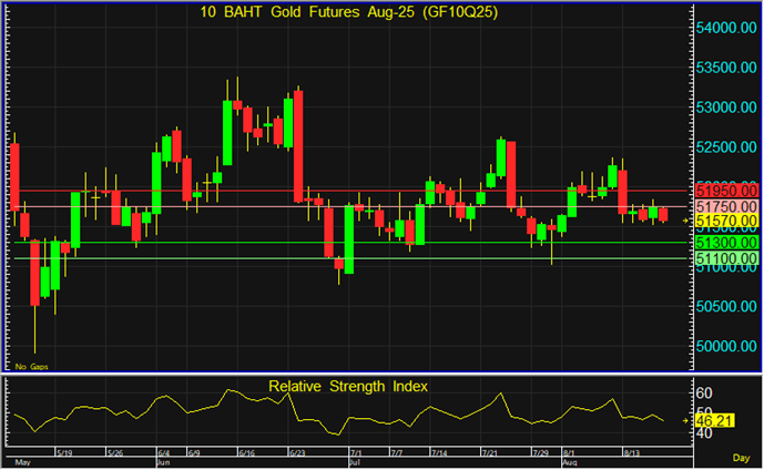 แม้ราคา GF10Q25 จะเริ่มย่อตัวลง แต่ประเมินว่าราคาอาจยังเคลื่อนไหวในกรอบ 51,350- 51,750 บาท จึงแนะนำเปิด Short หากราคาขึ้นทดสอบกรอบบน และเปิด Long หากราคาลงทดสอบจากกรอบล่าง