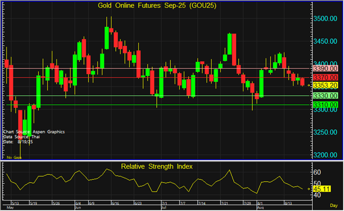 แม้ราคา GOU25 จะเริ่มย่อตัวลง แต่ประเมินว่าราคาอาจยังเคลื่อนไหวในกรอบ 3,330-3,370 ดอลลาร์ จึงแนะนำเปิด Short หากราคาขึ้นทดสอบกรอบบน และเปิด Long หากราคาลงทดสอบจากกรอบล่าง