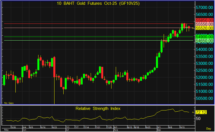 แม้ GF10V25 จะเริ่มฟื้นตัวกลับขึ้นมา แต่ราคายังคงซื้อขายบริเวณแนวต้านที่ระดับ 55,550 บาท จึงแนะนำรอเปิด Short จากแนวต้านดังกล่าว โดยมีเป้าหมายทำกำไรที่ระดับ 54,900 บาท และตัดขาดทุนหากราคาทะลุแนวต้านที่ระดับ 55,850 บาทขึ้นไป