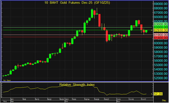 ราคา GF10Z25 เริ่มเผชิญแรงขายจากแนวต้านสำคัญที่ระดับ 63,000 บาท จึงแนะนำรอเปิด Short จากแนวต้านดังกล่าว โดยมีเป้าหมายทำกำไรที่ระดับ 61,900 บาท และตัดขาดทุนหากราคาทะลุแนวต้านที่ระดับ 63,600 บาทขึ้นไป