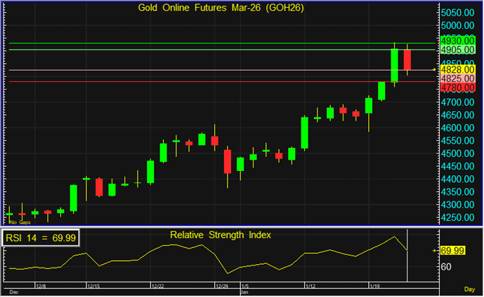 ราคา GOH26 ที่ย่อตัวลงแรงในช่วงเช้า เริ่มฟื้นตัวกลับอีกครั้ง แต่ยังแนะนำรอเปิด Long จากแนวรับที่ระดับ 4,825 ดอลลาร์ โดยมีเป้าหมายทำกำไรที่ระดับ 4,905 ดอลลาร์ และตัดขาดทุนหากราคาหลุดแนวรับที่ระดับ 4,780 ดอลลาร์ลงไป