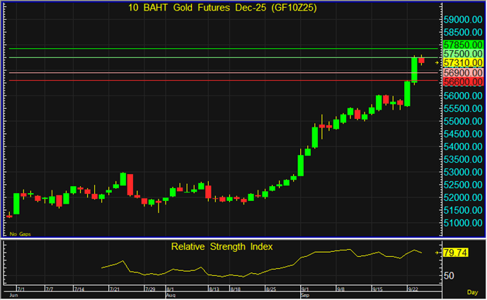 ราคา GF10Z25 เผชิญแรงขายจากแนวต้านที่ระดับ 57,500 บาท จึงกลับมาแนะนำรอเปิด Short จากแนวต้านดังกล่าว โดยมีเป้าหมายทำกำไรที่ระดับ 56,900 บาท และตัดขาดทุนหาราคาทะลุแนวรับต้านที่ระดับ 57,850 บาทขึ้นไป