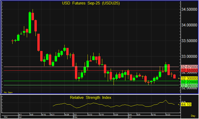 USDU25 มีแนวโน้มปรับฐานลง แต่ประเมินว่า Downside อาจเริ่มเหลือน้อยแล้ว จึงแนะนำรอเปิด Long จากแนวรับที่ระดับ 32.22 บาท โดยมีเป้าหมายทำกำไรที่ระดับ 32.55 บาท และตัดขาดทุนหากราคาทะลุแนวรับที่ 32.08 บาทลงไป