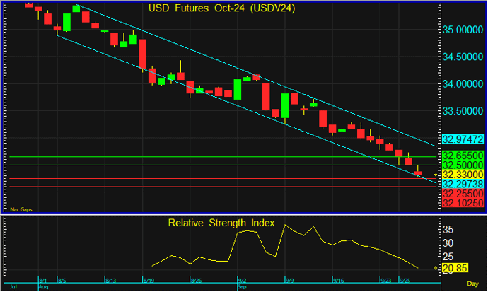 USDV24 ปรับตัวลงเร็วและแรงกว่าที่เคยประเมิน แต่มองว่าราคากำลังทดสอบแนวรับสำคัญ ซึ่งราคาอาจดีดตัวสั้นๆ ก่อนจะปรับตัวลงต่อจากแนวโน้มการลดดอกเบี้ยของ Fed แนะนำรอ Long สัญญา USDV24 ที่ 32.25 บาท โดยมีเป้าหมายทำกำไรที่ 32.50 บาท และตัดขาดทุนหากทะลุระดับ 32.10 บาท