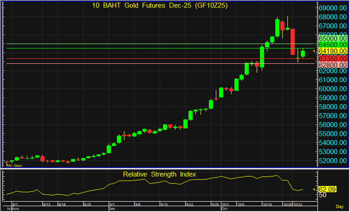 แม้ราคา GF10Z25 จะเริ่มฟื้นตัวขึ้น แต่ประเมินว่าอาจผ่านแนวต้านที่ระดับ 64,500 บาทขึ้นไปได้ยาก จึงแนะนำรอเปิด Short จากแนวต้านดังกล่าว โดยมีเป้าหมายทำกำไรที่ระดับ 63,350 บาท และตัดขาดทุนหากราคาทะลุแนวต้านที่ระดับ 65,000 บาทขึ้นไป