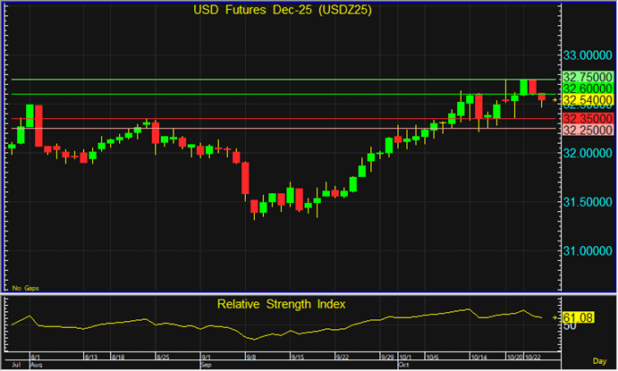 ราคา USDZ25 ย่อตัวลงมา แต่ยังแนะนำรอเปิด Short จากแนวต้านที่ระดับ 32.60 บาท โดยมีเป้าหมายทำกำไรที่ระดับ 32.35 บาท และตัดขาดทุนหากราคาทะลุแนวต้านที่ระดับ 32.75 บาทขึ้นไป