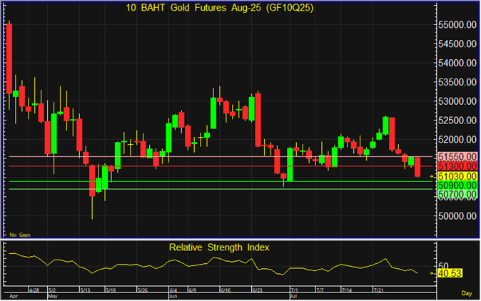 ช่วงเช้าราคา GF10Q25 ฟื้นตัวขึ้นมาอีกครั้ง แต่มีแนวต้านสำคัญที่ระดับ 51,300 บาท ซึ่งราคาอาจผ่านขึ้นไปได้ยาก จึงแนะนำรอเปิด Short จากแนวต้านดังกล่าว โดยมีเป้าทำกำไรที่ 50,900 บาท และตัดขาดทุนหากราคาทะลุแนวต้านที่ระดับ 51,550 บาทขึ้นไป