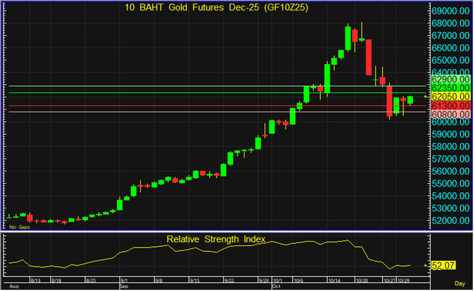 แม้ราคา GF10Z25 จะฟื้นตัวขึ้นมา แต่ประเมินว่าอาจติดแนวต้านที่ระดับ 62,350 บาท จึงแนะนำรอเปิด Short จากแนวต้านดังกล่าว โดยมีเป้าหมายทำกำไรที่ระดับ 61,300 บาท และตัดขาดทุนหากราคาทะลุแนวต้านที่ระดับ 62,900 บาทขึ้นไป