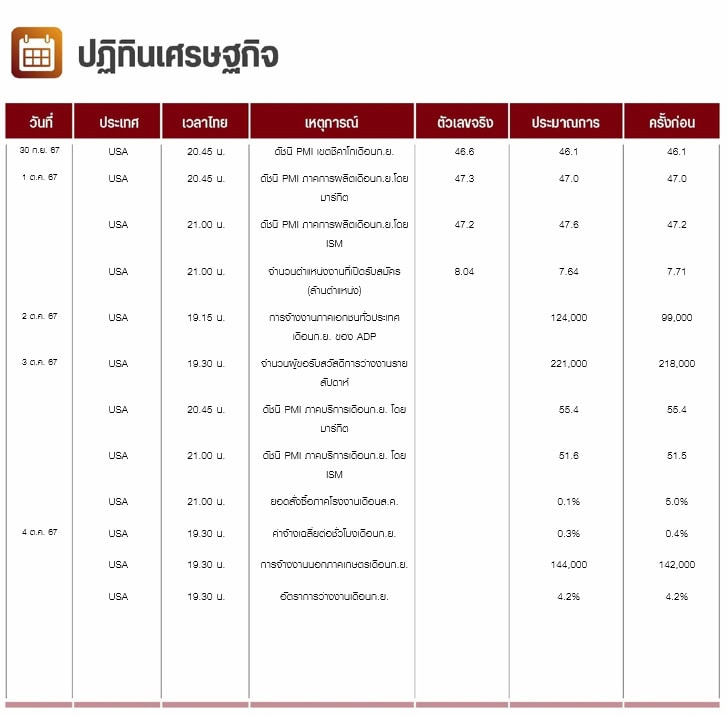 คืนนี้สหรัฐจะเปิดเผยการจ้างงานภาคเอกชนทั่วประเทศเดือนก.ย. ของ ADP ตลาดคาดว่าจะเพิ่มขึ้น 124,000 ตำแหน่ง จากที่เพิ่มขึ้น 99,000 ตำแหน่ง