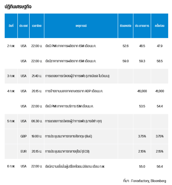 คืนนี้เวลา 20.15 น. สหรัฐฯ เผยการจ้างงานนอกภาคเกษตรจาก ADP เดือนม.ค. และ 22.00น. เผยดัชนี PMI ภาคการบริการ ISM เดือนม.ค.