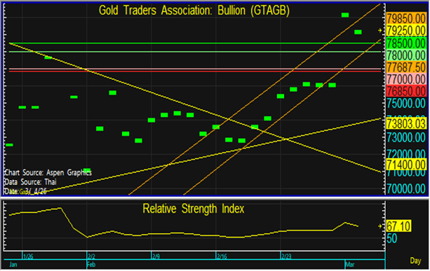 ราคาทองในประเทศมีการปรับตัวลงตามทองโลก ในขณะที่ค่าเงินบาทอ่อนค่าต่อเนื่อง จึงแนะนำทยอยขายตามแนวต้านที่ระดับ 78,000 และทยอยซื้อตามแนวรับที่ 77,000 บาท แต่หากราคาหลุดแนวรับที่ 76,850 บาท ลงไป แนะนำขายตัดขาดทุน