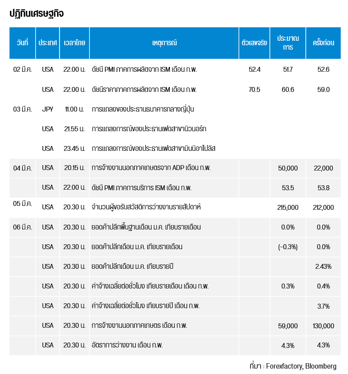 คืนนี้เวลา 20.15 น. สหรัฐฯ เผยการจ้างงานนอกภาคเกษตรจาก ADP เดือน ก.พ. และเวลา 22.00 น. เผยดัชนี PMI ภาคการบริการ ISM เดือน ก.พ.