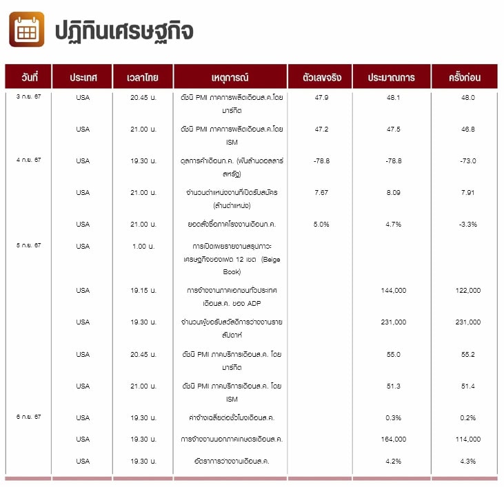 คืนนี้สหรัฐจะเปิดเผยการจ้างงานภาคเอกชนทั่วประเทศเดือนส.ค. ของ ADP ตลาดคาดว่าจะเพิ่มขึ้น 144,000 ตำแหน่ง จากเพิ่มขึ้น 122,000 ตำแหน่ง จำนวนผู้ขอรับสวัสดิการว่างงานรายสัปดาห์ ตลาดคาดว่าจะทรงตัวที่ 231,000 ราย และดัชนี PMI ภาคบริการเดือนส.ค. โดย ISM ตลาดคาดว่าจะลดลงสู่ระดับ 51.3 จาก 51.4 ในเดือนก.ค.
