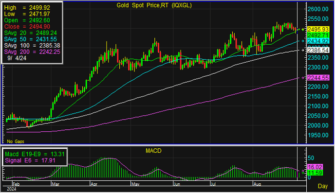 ราคาทองคำผันผวน ซึ่งราคาทองคำปรับตัวลงแรงเข้าใกล้แนวรับ 2,470 ดอลลาร์ ก่อนที่จะมีแรงซื้อกลับดันให้ราคาทองคำปรับตัวขึ้นในช่วงกลางคืน และปิดตลาดบวกเล็กน้อย โดยราคาทองคำได้รับแรงหนุนจากเงินดอลลาร์กลับทิศทางอ่อนค่าลง หลังจากจำนวนตำแหน่งงานที่เปิดรับสมัคร เดือนก.ค.ลดลงเหลือ 7.67 ล้านตำแหน่ง ซึ่งเป็นระดับต่ำที่สุดนับตั้งแต่เดือนม.ค. 2564  ส่วนกองทุน SPDR ถือครองทองคำเท่าเดิม