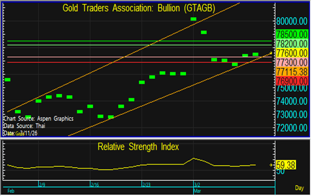 ราคาทองในประเทศมีการปรับตัวขึ้นตามทองโลก ในขณะที่ค่าเงินบาทอ่อน / แข็งค่า จึงแนะนำทยอยขายตามแนวต้านที่ระดับ 78,200 และทยอยซื้อตามแนวรับที่ 77,300 บาท แต่หากราคาหลุดแนวรับที่ 76,900 บาท ลงไป แนะนำขายตัดขาดทุน