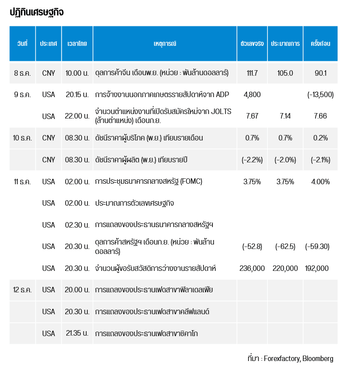 ทองโลกมีการปรับตัวขึ้น จากการที่ดัชนีเงินดอลลาร์ (DXY) ได้ปรับตัวลงเป็นวันที่ 2 สู่ระดับ 98.33 หน่วย จาก 99.21 หน่วย อีกทั้งบอนด์ยีลด์สหรัฐฯ อายุ 10 ปี ยังคงทรงตัวอยู่ในระดับ 4.15% สืบเนื่องมาจากเฟดได้ปรับลดอัตราดอกเบี้ยเมื่อวันพุธลง 0.25% สู่ระดับ 3.50 – 3.75% ในขณะที่นายอาทิตยา บาฟ (Aditya Bhave) นักเศรษฐศาสตร์อาวุโสของ Bank of America (BoFA) ได้คาดการณ์เมื่อวันจันทร์ว่า เฟดอาจลดดอกเบี้ยอีกสองครั้งในเดือนมิ.ย.และก.ค.ปี 2026 เนื่องด้วยประธานเฟดคนใหม่ที่อาจทำให้เฟดเพิ่มความเสี่ยงในการผลักดันนโยบายเข้าสู่โหมดผ่อนคลาย และส่งผลให้อัตราดอกเบี้ยในปี 2026 อยู่ในช่วง 3.0% – 3.25% อย่างไรก็ตาม ตลาด CME FedWatch ได้คาดการณ์ถึง 75.6% และ 50.4% ว่าเฟดอาจตรึงดอกเบี้ยที่ 3.50 – 3.75% ตามลำดับ หลังถ้อยแถลงของนายเจอโรม พาวเวล ประธานเฟด ที่ได้แสดงความเห็นว่าอัตราดอกเบี้ยที่ระดับ 3.5-3.75% คือระดับที่เหมาะสมแล้ว ในขณะที่กรรมการเฟดทุกคนมีความเห็นตรงกันว่าเงินเฟ้ออยู่ในระดับสูงเกินไป และเฟดต้องการให้เงินเฟ้อปรับตัวลดลง  ทางด้านกองทุน SPDR ซื้อทองคำ 4.01 ตัน รวมสุทธิ 1,050.83 ตัน