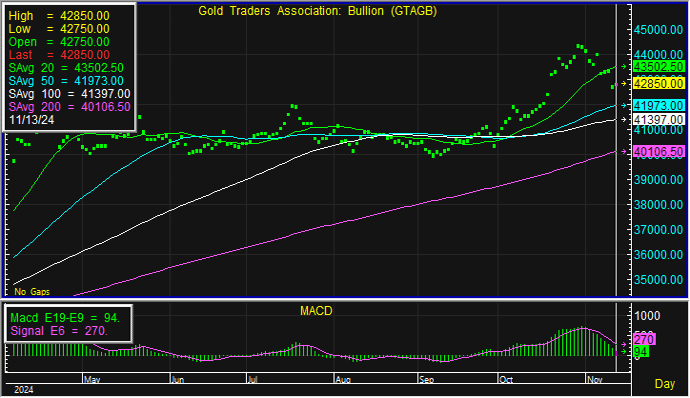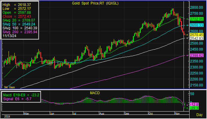 ราคาทองคำเคลื่อนไหวผันผวน โดยช่วงกลางวันราคาทองคำมีการฟื้นตัวขึ้นเข้าใกล้แนวต้าน 2,620 ดอลลาร์ ก่อนที่จะเกิดแรงเทขายออกมา และปิดตลาดที่จุดต่ำสุดของวัน ซึ่งราคาทองคำได้รับแรงกดดันจากเงินดอลลาร์แข็งค่าสุดในรอบ 6 เดือน หลังจากดัชนีราคาผู้บริโภค (CPI) เดือนต.ค.เพิ่มขึ้น 2.6% เท่ากับตลาดคาด แต่เร่งสูงขึ้น ตลาดให้น้ำหนักมากขึ้นถึง 82.8% ว่าเฟดจะลดดอกเบี้ย 0.25% ในการประชุมเดือนธ.ค. จากเดิมที่ให้น้ำหนักเพียง 58.7% ส่วนกองทุน SPDR ขายทอง 2.01 ตัน