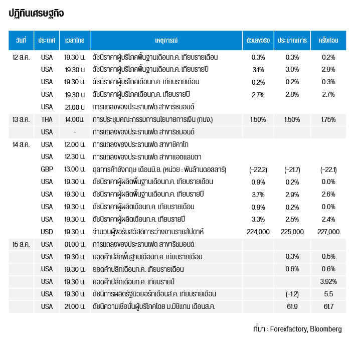 คืนนี้เวลา 19.30 น. สหรัฐฯ ประกาศยอดค้าปลีกทั่วไป / พื้นฐานเดือนก.ค. , ดัชนีการผลิตรัฐนิวยอร์กเดือนส.ค. เทียบรายเดือน และเวลา 21.00 น. ประกาศดัชนีความเชื่อมั่นผู้บริโภคโดย ม.มิชิแกน เดือนส.ค.