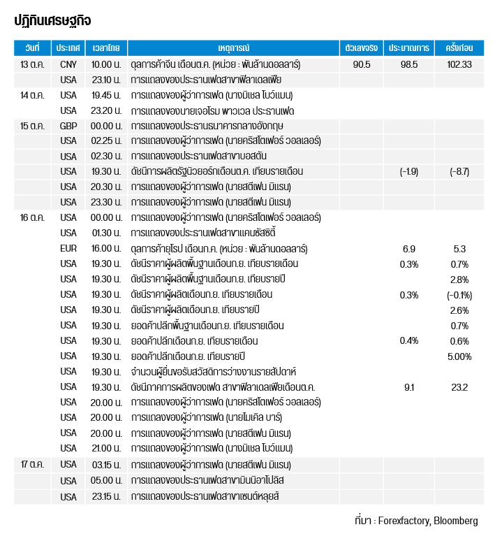 นักเศรษฐศาสตร์ของซิตี้ กรุ๊ป ได้กล่าวว่า มีความเป็นไปได้ที่ภาวะชัตดาวน์สหรัฐฯ อาจยืดเยื้อถึงเดือนพ.ย. และการที่พนักงานของรัฐจำนวน 750,000 คนถูกพักงานชั่วคราว อาจไม่ได้เป็นปัจจัยเพียงพอที่จะทำให้พรรคเดโมแครต – รีพับลิกันยอมประนีประนอมกันได้ และคาดว่าการชัตดาวน์นี้จะส่งผลกระทบต่อ GDP สหรัฐฯ ราว 0.8% อย่างไรก็ตาม ทาง IMF ได้คาดการณ์ว่าเศรษฐกิจของสหรัฐฯ อาจขยายตัว 2% ในปีนี้ จากที่การคาดการณ์ 1.9% และ 1.8% ในเดือน ก.ค. และ เม.ษ. ตามลำดับ เนื่องจากสหรัฐฯ ได้ข้อตกลงการค้ากับนานาประเทศและให้การยกเว้นในหลายกรณี ทางด้านกองทุน SPDR ซื้อทองคำ 2.57 ตัน รวมสุทธิ 1,021.45 ตัน