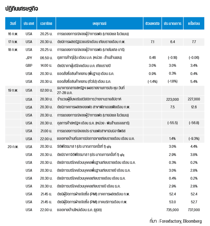 คืนนี้เวลา 20.30 น. สหรัฐฯ เผยจำนวนผู้ยื่นขอรับสวัสดิการว่างงานรายสัปดาห์ , ดัชนีภาคการผลิตของเฟด สาขาฟิลาเดลเฟียเดือน ก.พ. , ดุลการค้าสหรัฐฯ เดือน ธ.ค. และเวลา 22.00 น. เผยยอดขายบ้านที่รอการปิดการขายเทียบรายเดือน เดือน ม.ค.