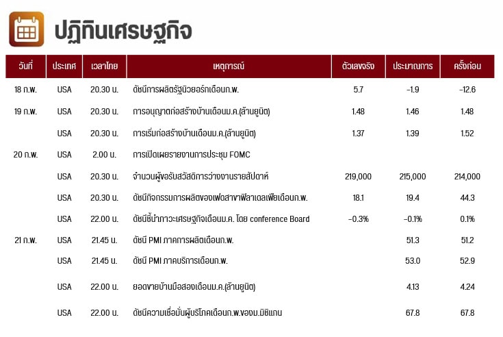 คืนนี้สหรัฐจะเปิดเผยดัชนี PMI ภาคการผลิตและภาคบริการเดือนก.พ. ตลาดคาดว่าจะเพิ่มขึ้นสู่ระดับ 51.3 และ 53.0 ตามลำดับ นอกจากนี้ติดตามยอดขายบ้านมือสองเดือนม.ค. และดัชนีความเชื่อมั่นผู้บริโภคเดือนก.พ.ของม.มิชิแกน