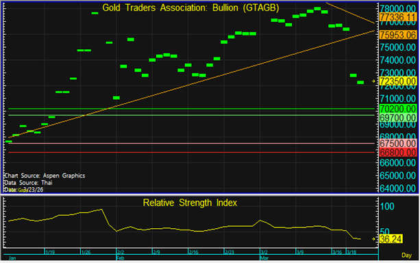 ราคาทองในประเทศมีการแกว่งตัวขึ้น / ลงตามทองโลก ในขณะที่ค่าเงินบาทอ่อนค่า จึงแนะนำทยอยขายตามแนวต้านบริเวณ69,700 และ 70,200 บาท และทยอยซื้อตามแนวรับที่ 67,500 บาท แต่หากราคาหลุดแนวรับที่ 66,800 บาท แนะนำขายตัดขาดทุน