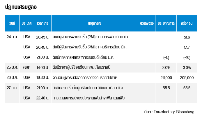 ทองโลกมีการปรับตัวลง จากการที่ดัชนีเงินดอลลาร์ (DXY) ยังคงทรงตัวที่ระดับ 99.54 หน่วย อีกทั้งบอนด์ยีลด์สหรัฐฯ อายุ 10 ปี ได้ปรับตัวขึ้นในวันเดียวกัน สู่ระดับ 4.38% จาก 4.27% สืบเนื่องมาจากราคาน้ำมันดิบ Brent ได้ปรับตัวขึ้นถึง 10% ในช่วงวันที่ 16-20 มี.ค. จาก 97.86 ดอลลาร์ต่อบาร์เรล เป็น 107.66 ดอลลาร์ต่อบาร์เรล ซึ่งส่งผลให้ตลาด CME FedWatch ได้เริ่มคาดการณ์ถึง 6.2% ว่าเฟดอาจขึ้นดอกเบี้ย 0.25% ในการประชุมในครั้งถัดไป นอกจากนี้ เจ้าหน้าที่ซาอุฯ เปิดเผยว่า ขณะนี้ผู้ซื้อน้ำมันจากเอเชียบางรายได้ซื้อน้ำมันในราคา 125 ดอลลาร์/บาร์เรลแล้ว และคาดว่าราคาน้ำมันจะแตะระดับ 150 ดอลลาร์ในช่วงต้นเดือนเมษายน และได้มีการคาดการณ์ว่าหากสงครามลากยาวถึงปลายเดือนเม.ษ. อาจทำให้ราคาน้ำมันพุ่งแตะ 165-180 ดอลลาร์ / บาร์เรล อย่างไรก็ตาม ตลาดยังคงจับตาท่าทีสหรัฐฯ – NATO หลังปธน.ทรัมป์ ผู้นำสหรัฐฯ โพสต์ข้อความบน Truth Social เมื่อวันศุกร์โดยระบุว่า NATO คือกลุ่มที่ไม่มีประสิทธิภาพ หากไม่มีสหรัฐฯ เนื่องจากทรัมป์แสดงความไม่พอใจที่ NATO ไม่ให้ความร่วมมือในการเปิดช่องแคบฮอร์มุซ ทางด้านกองทุน SPDR ขายทองคำ 14.57 ตัน ในสัปดาห์ก่อน รวมสุทธิ 1,056.99 ตัน