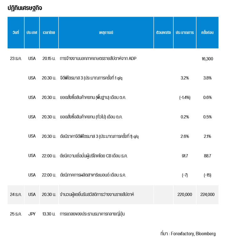 คืนนี้เวลา 20.15 น. สหรัฐฯ เผยการจ้างงานนอกภาคเกษตรรายสัปดาห์จาก ADP , เวลา 20.30 น. จีดีพีไตรมาส 3 (ประมาณการครั้งที่ 2 q/q) , ดัชนีราคาจีดีพีไตรมาส 3 (ประมาณการครั้งที่ 1) q/q , ยอดสั่งซื้อสินค้าคงทน พื้นฐาน / ทั่วไป เดือน ต.ค. และเวลา 22.00น. ดัชนีความเชื่อมั่นผู้บริโภคโดย CB เดือน ธ.ค.