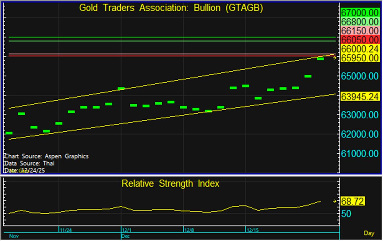 จึงแนะนำทยอยขายตามแนวต้านที่ระดับ 66,800 และทยอยซื้อตามแนวรับที่ 66,150 บาท แต่หากราคาหลุดแนวรับที่ 66,050 บาท ลงไป แนะนำขายตัดขาดทุน