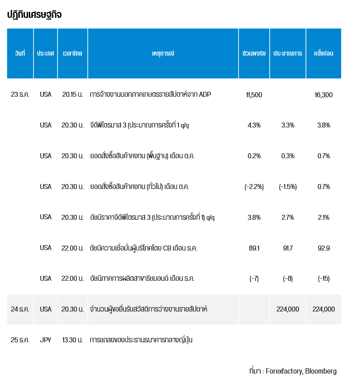 ทองโลกกลับตัวเป็นขาขึ้น จากการที่ดัชนีเงินดอลลาร์ (DXY) ได้ปรับตัวลงเป็นวันที่ 2 สู่ระดับ 97.90 หน่วย จาก 98.66 หน่วย อีกทั้งบอนด์ยีลด์สหรัฐฯ อายุ 10 ปียังคงทรงตัวที่ระดับ 4.16% ในขณะที่สภาทองคำโลก (World Gold Council) ระบุว่า การใช้จ่ายทางการคลังที่เพิ่มขึ้น, อุปสงค์จากธนาคารกลาง และอัตราดอกเบี้ยที่ต่ำลง อาจช่วยหนุนราคาให้พุ่งขึ้นได้อีก 5%-15% ในปี 2026 โดยนายโจ คาวาโทนี (Joe Cavatoni) นักยุทธศาสตร์การตลาดอาวุโสจากสภาทองคำโลก ได้กล่าวถึงการเติบโตทางเศรษฐกิจชะลอตัวลงและอัตราดอกเบี้ยยังคงลดลง จะส่งผลให้ทองคำอาจเห็นการปรับตัวขึ้น อย่างไรก็ตาม ตลาด CME FedWatch ได้ปรับคาดการณ์ขึ้นเป็น 86.7% จาก 80.1% ว่าเฟดจะยังคงดอกเบี้ยไว้ที่ระดับ 3.50-3.75% ในเดือนม.ค. ในขณะที่สหรัฐฯ เผยดัชนี GDP ไตรมาส 3 ประมาณการครั้งที่ 2 มากกว่าที่นักวิเคราะห์คาดการณ์ / ครั้งก่อน นอกจากนี้ นายไมค์ แมคโกลน (Mike McGlone) นักยุทธศาสตร์จาก Bloomberg Intelligence ได้กล่าวว่า ราคาทองคำสามารถลงมาที่ 3,500 ดอลลาร์ได้ โดยอ้างอิงถึงราคาทองคำพุ่งทะยานในปี 1979 และทำราคาสูงสุดในปี 1980 หลังจากนั้นราคากลับดิ่งลงมากกว่า 50% ภายในปี 1982 ทางด้านกองทุน SPDR ถือครองเท่าเดิมรวมสุทธิ 1,064.56 ตัน