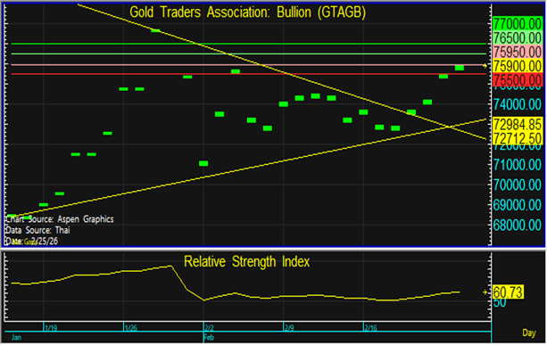 ราคาทองในประเทศมีการปรับตัวขึ้นตามทองโลก ในขณะที่ค่าเงินบาทแข็งค่า จึงแนะนำทยอยขายตามแนวต้านที่ระดับ 76,500 และทยอยซื้อตามแนวรับที่ 75,950 บาท แต่หากราคาหลุดแนวรับที่ 75,500 บาท ลงไป แนะนำขายตัดขาดทุน