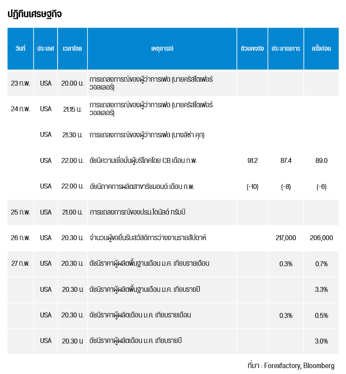 ทองโลกได้มีการปรับตัวลง จากการที่ดัชนีเงินดอลลาร์ (DXY) ได้ปรับตัวขึ้นสู่ระดับ 97.88 หน่วย จากระดับต่ำสุดที่ 97.85 หน่วย ในขณะที่ตลาดยังจับตาปธน.ทรัมป์ เตรียมแถลงนโยบายประจำปี (State of the Union) ครั้งสำคัญต่อสภาคองเกรส ตามคำเชิญของนายไมค์ จอห์นสัน ประธานสภาผู้แทนราษฎรสหรัฐฯ โดยตลาดได้มุ่งเน้นไปยังประเด็นภาษีศุลกากรชุดใหม่หลังศาลฎีกาตัดสินว่าภาษีภายใต้ IEEPA ไม่ชอบด้วยกฎหมาย, ประเด็นหารเจรจาระหว่างสหรัฐฯ – อิหร่าน และแนวโน้มการเดินทางเยือนจีนระหว่างวันที่ 31 มี.ค.-2 เม.ย. เพื่อเข้าพบกับปธน.สี จิ้นผิง อย่างไรก็ตาม นายเรียวเซ อากาซาวะ รมว.กระทรวงการค้าญี่ปุ่น ได้ยื่นเรื่องขอให้สหรัฐฯ รับประกันว่ามาตรการภาษีใหม่นี้จะไม่ทำให้ญี่ปุ่นต้องเผชิญกับเงื่อนไขที่รุนแรงกว่าข้อตกลงการค้าที่บรรลุไปแล้วเมื่อปี 2025 และทาง EU ต้องการความแน่นอนในด้านภาษีการค้าภายหลังที่ EU แสดงความไม่พอใจต่อสหรัฐฯ ในประเด็นภาษีการค้า มาตรา 122 ที่กำลังละเมิดข้อตกลงการค้าเมื่อปี 2025 ซึ่งความไม่แน่นอนดังกล่าว อาจทำให้ความขัดแย้งภายในชาติพันธมิตรสหรัฐฯ อาจเกิดความขัดแย้งในภายหลัง ทางด้านกองทุน SPDR ซื้อทองคำ 7.72 ตัน รวมสุทธิ