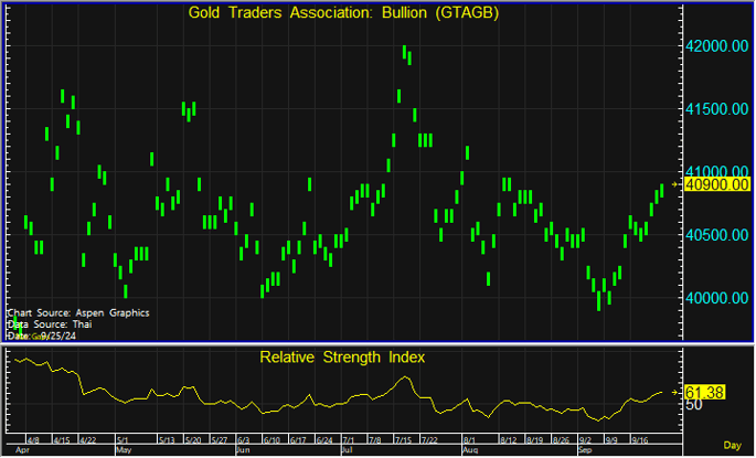 ราคาปรับตัวขึ้นจากตัวเลขเศรษฐกิจสหรัฐที่อ่อนแอลง และปัญหาทางด้านภูมิรัฐศาสตร์ รวมถึงการกระตุ้นเศรษฐกิจจากจีน แต่ทองไทยยังถูกค่าเงินกดดันจึงปรับตัวขึ้นไม่มาก แต่มองเป็นจังหวะในการเข้าสะสมทองคำเพิ่ม โดยมีเป้าหมายทำกำไรที่ระดับ 41,400- 41,500 บาท