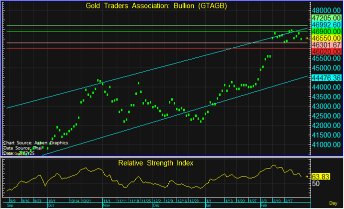 ราคาทองคำแท่ง ยังเคลื่อนไหวอยู่ในกรอบเดิมที่ระดับ 46,300-47,000 บาท โดยราคายังคงซื้อขายกันที่บริเวณแนวรับ-แนวต้าน ซึ่งประเมินว่าอาจเป็นจังหวะในการแบ่งขายทำกำไร และกลับเข้าซื้ออีกครั้งหากราคาลงทดสอบแนวรับสำคัญที่ 46,300 บาท