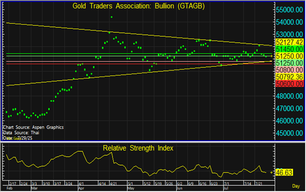 ราคาทองในประเทศอยู่ในระยะปรับฐานลง จากการที่ทองโลกยังคง Sideway ขณะที่ค่าเงินบาทอ่อนค่าต่อเนื่องเป็นวันที่ 4 จึงแนะนำเข้าซื้อสะสมแนวรับที่ระดับ 50,800 บาท และขายทำกำไรหากราคาทดสอบแนวต้านที่ 51,250 บาท แต่หากราคาหลุดแนวรับที่ 50,600 บาทลงไป แนะนำขายตัดขาดทุน