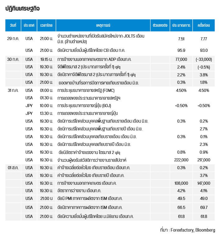 คืนนี้เวลา 21.00 น. สหรัฐฯ ประกาศจำนวนตำแหน่งงานที่เปิดรับสมัครใหม่จาก JOLTS เดือน มิ.ย. และ ดัชนีความเชื่อมั่นผู้บริโภคโดย CB เดือน ก.ค.