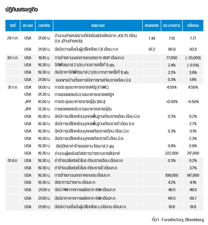 คืนนี้เวลา 19.15 น. สหรัฐฯ ประกาศการจ้างงานนอกภาคเกษตรจาก ADP เดือนก.ค. และเวลา 19.30 น. ประกาศจีดีพีไตรมาส 2 (ประมาณการครั้งที่ 1) q/q รวมถึง ดัชนีราคาจีดีพีไตรมาส 2 (ประมาณการครั้งที่ 1) q/q และ เวลา 21.00 น. ประกาศยอดขายบ้านที่รอการปิดการขายเทียบรายเดือน มิ.ย.
