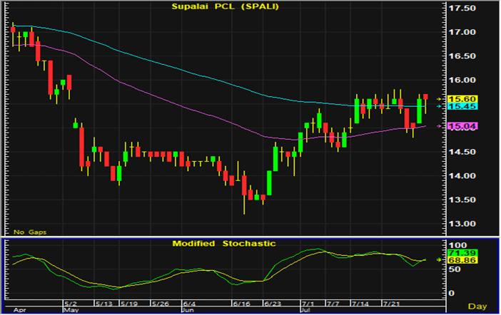ราคาหุ้น SPALI อ่อนตัวลงในการซื้อขายวานนี้ คาดว่าเป็นการปรับฐานในระยะสั้นหลังปรับตัวขึ้นมากในการซื้อขายวันก่อนหน้า หากในระหว่างวันสามารถยืนเหนือแนวรับ 15.3-15.4 บาท แนะนำเปิดสถานะซื้อ และมีจุดขายตัดขาดทุนอยู่ที่ 15 บาท