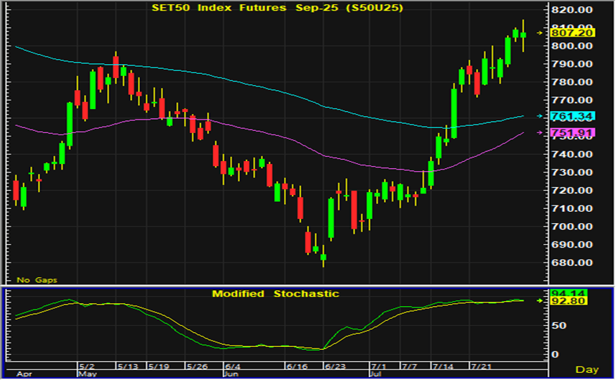 ตลาดหุ้นไทยวานนี้แกว่งตัวผันผวนเคลื่อนไหวสลับขึ้นลงทั้งแดนบวกและลบ ก่อนที่จะปิดตลาดอ่อนตัวลง หุ้นในหลายกลุ่มซึ่งปรับตัวขึ้นมามากในการซื้อขายช่วงหลายสัปดาห์ที่ผ่านมาต่างมีแรงขายเพื่อลดความเสี่ยงกลับออกมา ประเด็นต่างประเทศทั้งจากทิศทางดอกเบี้ยของสหรัฐที่อาจปรับลงช้ากว่าที่นักลงทุนประเมิน รวมทั้งผลกระทบของมาตรการภาษีของสหรัฐที่แม้จะปรับลดลงจากที่เคยประกาศไว้ในเดือนเมษายน แต่ก็จะส่งผลต่อเศรษฐกิจโดยรวม ยังคงเป็นปัจจัยกดดันการลงทุน ขณะที่ประเด็นการเมืองในประเทศทั้งการพิจารณาคดีบุคคลที่เกี่ยวข้องกับรัฐบาลซึ่งคาดว่าจะมีความชัดเจนในเดือนนี้ รวมทั้งการชุมนุมทางการเมืองช่วงสุดสัปดาห์นี้เป็นปัจจัยที่คาดว่าจะทำให้ตลาดหุ้นไทยในวันนี้มีแนวโน้มอ่อนตัว การเก็งกำไรในสัญญาเดือน U แนะนำรอเปิดสถานะซื้อใกล้แนวรับ 801-802 จุด และมีจุดขายตัดขาดทุนอยู่ที่ 797 จุด โดยมีแนวต้านสำหรับเก็งกำไรฝั่งขายอยู่ที่ 814-815 จุด และมีจุดปิดสถานะตัดขาดทุนอยู่ที่ 817 จุด