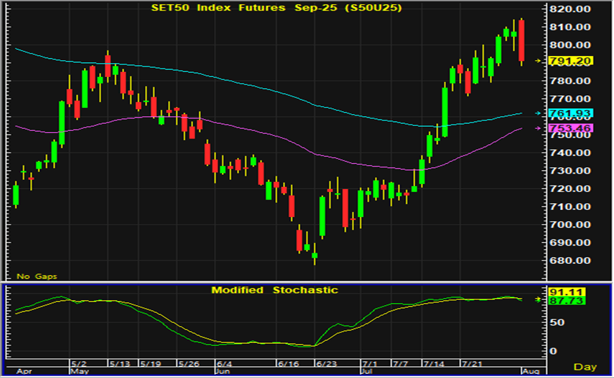 ตลาดหุ้นไทยปิดตลาดปรับตัวลงในปริมาณมากในการซื้อขายวันศุกร์ แต่ยังเป็นการปิดตลาดเพิ่มขึ้นต่อเนื่องเป็นสัปดาห์ 6 การเจรจาการค้าระหว่างสหรัฐและประเทศต่างๆที่บรรลุข้อตกลงในการลดภาษีจากที่สหรัฐเคยประกาศไว้เป็นปัจจัยบวกต่อการลงทุน อย่างไรก็ตามด้วยราคาหุ้นดีดตัวขึ้นเก็งกำไรจากประเด็นนี้มาพอสมควรในช่วงก่อนหน้า ในวันศุกร์จึงมีแรงขายทำกำไรกลับออกมา ส่วนสัปดาห์นี้นอกจากรายงานผลประกอบการของบริษัทจดทะเบียนซึ่งต้องรอติดตามแล้ว ปัญหาความตึงเครียดทางภูมิรัฐศาสตร์หลังสหรัฐส่งเรือเข้าไปกกดันรัสเซีย รวมทั้งข้อมูลตลาดแรงงานของสหรัฐที่ออกมาต่ำกว่าคาด เป็นปัจจัยลบที่กลับมากดดันการลงทุน การเคลื่อนไหวของตลาดหุ้นไทยในระยะสั้นจึงกลับมามีแนวโน้มอ่อนตัว การเก็งกำไรในสัญญาเดือน U แนะนำรอเปิดสถานะซื้อใกล้แนวรับ 782-783 จุด และมีจุดขายตัดขาดทุนอยู่ที่ 780 จุด โดยมีแนวต้านสำหรับเก็งกำไรฝั่งขายอยู่ที่ 797-798 จุด และมีจุดปิดสถานะตัดขาดทุนอยู่ที่ 800 จุด